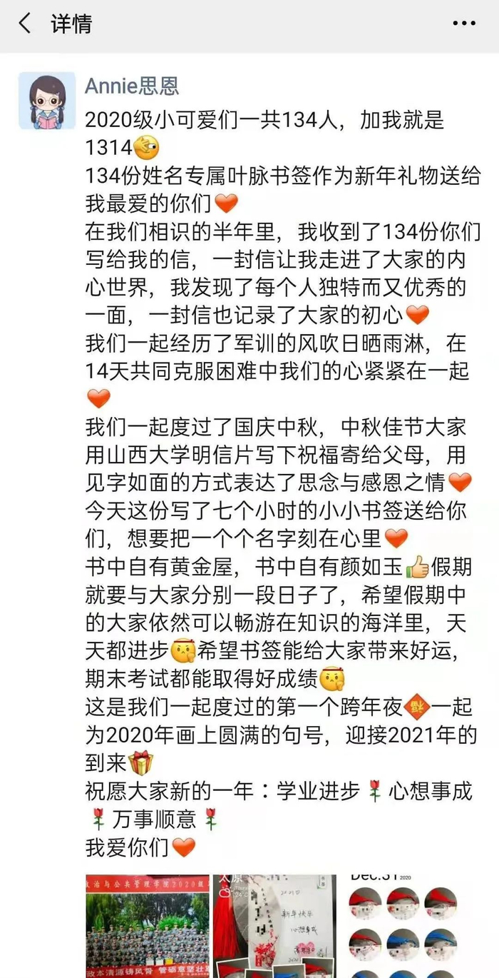 政治与公共管理学院2020级的134名同学也收到了辅导员高思恩的送给他们的别样“跨年礼”——带有深情祝福贺卡的精致叶脉书签。