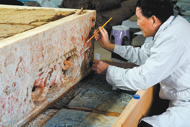 工作人员在对石棺床的彩绘进行加固。