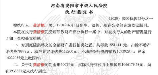 据《龚清概执行实施类执行裁定书》显示,河南安阳中院在执行龚清概犯受贿罪涉财产部分执行一案中,对被执行人的财产情况进行了如下查控处置措施: