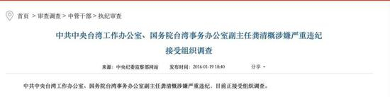 2013年10月,龚清概任中央台办、国台办副主任,2016年1月被查。