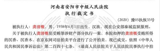 据《河南省安阳市中级人民法院执行裁定书》显示,法院扣押的龚清概受贿所得的沉香、沉香木,在京东网司法拍卖平台进行了公开拍卖,现已成交。