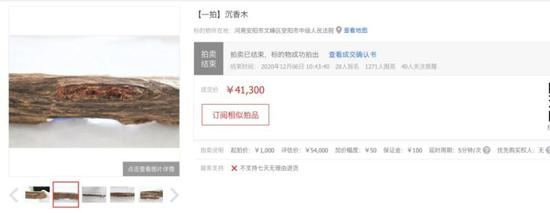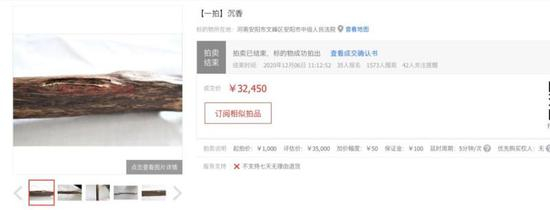 据京东网司法拍卖平台显示,在2020年12月初,安阳市中院曾拍卖了沉香、沉香木,前者的成交价为32450元,后者的成交价为41300元。