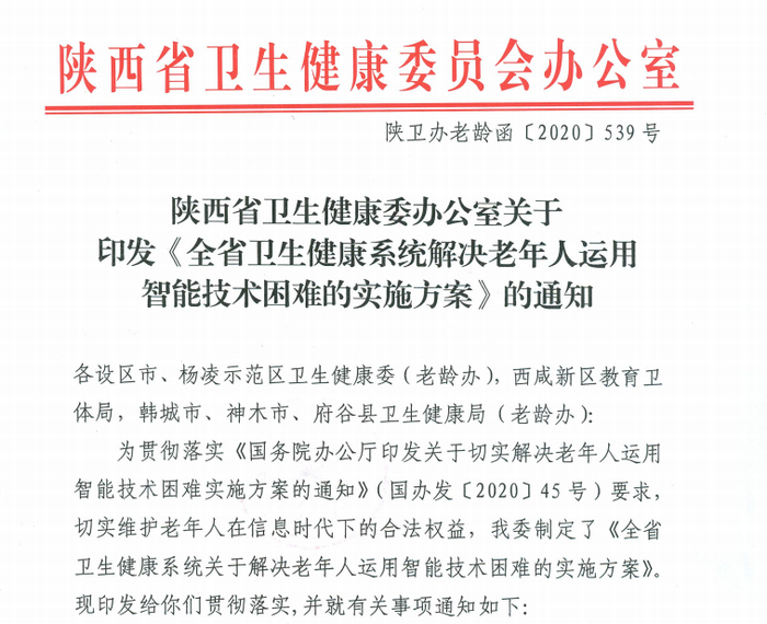为切实解决老年人运用智能技术困难,适应常态化疫情防控和老年人日常就医需求,维护老年人健康权益,陕西省卫健委日前制定下发了《全省卫生健康系统关于解决老年人运用智能技术困难的实施方案》。