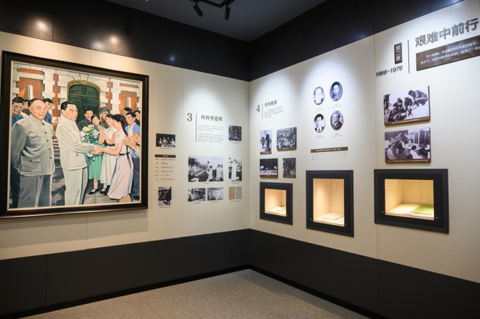 第四展厅讲述了云大建设成为社会主义大学的过程,1950年云南解放后,云南大学贯彻执行党的教育方针,进行思想改造和教学改革及其部分院系的调整,积极投入社会主义大学建设,学校发展又出现欣欣向荣的局面。