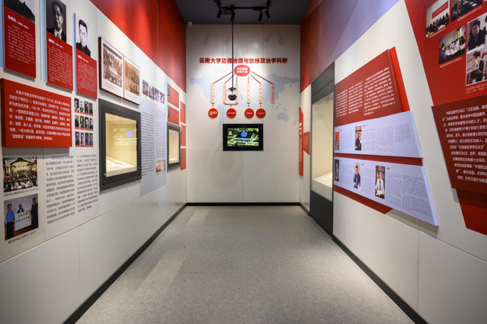 第八展厅讲述了云南大学边疆治理和地缘政治学科群的发展,该学科群目前包含“民族政治”、“边疆治理”、“区域与国别研究”、“地缘政治与周边外交”、“中国边疆学”等五个学科方向。学科群整合了云南大学最具优势的相关学科力量,紧紧围绕建设世界一流大学的目标,立足云南、服务国家、辐射两亚(南亚、东南亚),为国家和地方发展贡献力量。