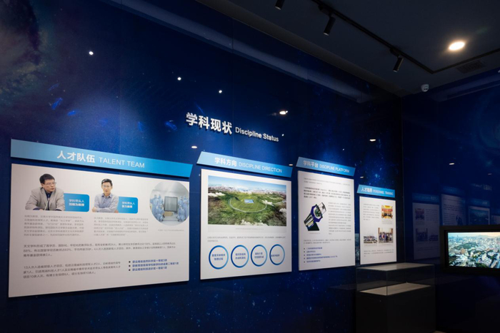 第十一展厅讲述了云南大学天文学一级学科的发展,近年来,天文学科聚集学科前沿和国家发展需求,着力优秀人才引进和拔尖人才培养,建设世界一流的学科平台,开展世界一流的基础前沿研究,形成了致密天体和高能现象、银河系与近场宇宙学、星系与宇宙学等特色方向,成为中国天文学版图不可或缺的重要组成部分。