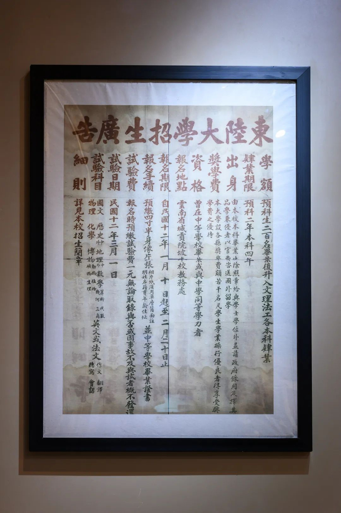 第二展厅讲述了东陆大学创立与发展,1922年,在唐继尧省长的支持下,董泽先生等人创办了东陆大学。东陆大学创办之初,多方筹资,延揽名师,筹建学科,兴建馆舍,添置设备,终使大学初见规模。此外,东陆大学还注重学生培养,提倡自由研究,倡导因材施教,并开展云南男女同校之风气。