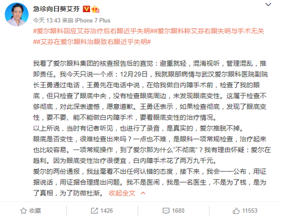 1月4日凌晨5点,爱尔眼科在官方微信公众号及微博平台发布了一则 《爱尔眼科医院集团关于艾芬女士诊疗过程的核查报告》中认为,“经核实,艾芬女士右眼视网膜脱离与本次白内障手术无直接关联”。