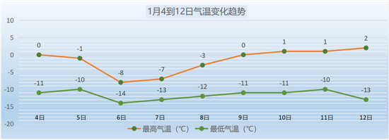 从目前来看,预计从4日到12日南郊观象台最高气温0℃至-8℃,最低气温-10℃至-14℃。其中,6日气温将跌入一个低谷,最高气温-8℃,最低气温-14℃。