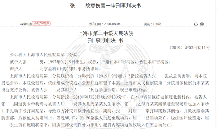 原标题:青浦一大学生未牵狗绳竟打死他人,被判10年→