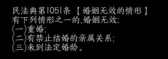 此前,按照原来《婚姻法》的相关规定,有下列情形之一的,婚姻无效:(一)重婚的;(二)有禁止结婚的亲属关系的;(三)婚前患有医学上认为不应当结婚的疾病,婚后尚未治愈的;(四)未到法定婚龄的。