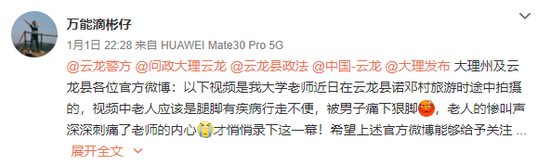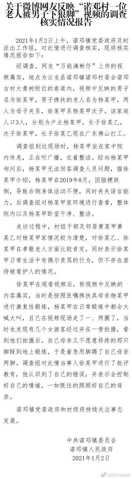 1月3日,云龙县政府官方微博“问政大理云龙”发布了关于微博网友反映“诺邓村一位老人被男子下狠脚”视频的调查核实情况报告。
