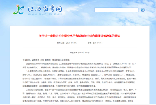 1月6日,江西省教育厅印发了《关于进一步推进初中学业水平考试和学生综合素质评价改革的通知》。记者获悉,2021年起江西全面实行初中学业水平考试,这意味着我省初中毕业、高中招生将正式“两考合一”。