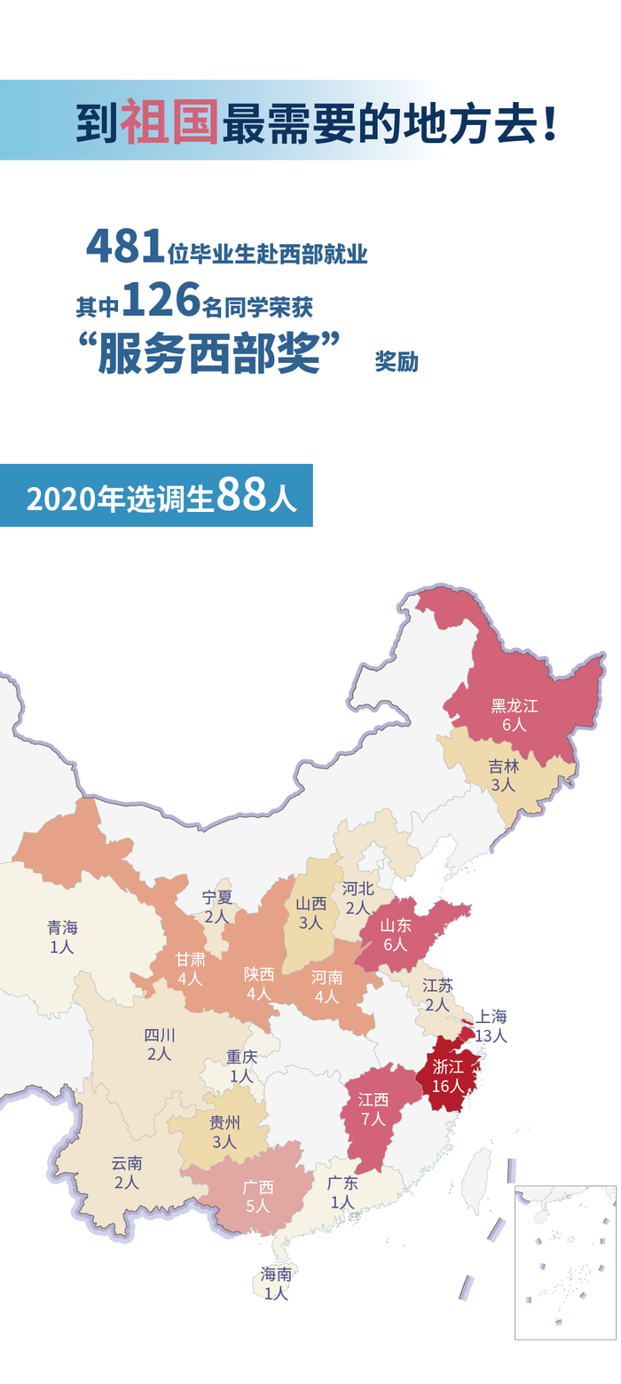 2020年,华东师大选调生就业人数为88人,比去年人数增长近一倍,分布在21个省(自治区、直辖市),其中本科17人,硕士71人。