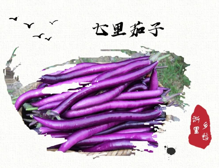 七里茄子主产区为衢州市柯城区七里乡。七里茄子果实长条形,果形匀称,四门斗茄子长度可达40cm以上,果皮薄、紫红色、有光泽,果肉洁白、细嫩,蒸煮后糯软微甜,品质上佳。