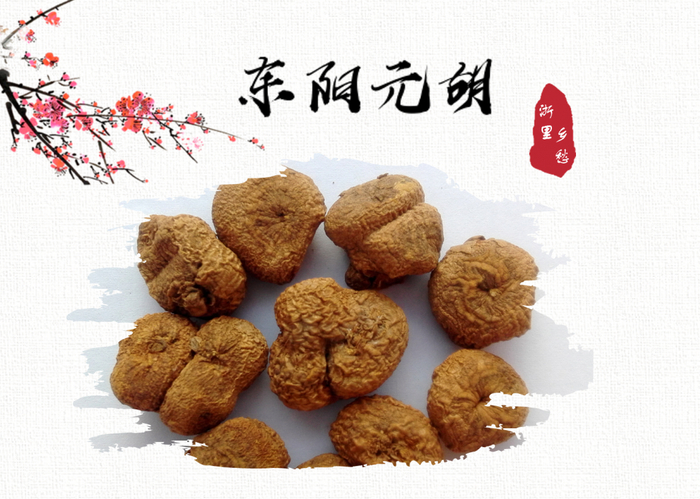 东阳元胡主要分布于东阳市辖区内按照相关法律法规划分的中药材适种区。东阳元胡呈不规则扁球形,粒大,直径0.6厘米以上,表面黄褐色,具不规则网状皱纹,顶端有略凹陷的茎痕,底部常有疙瘩状凸起。质硬而脆、断面黄色,角质样,有蜡样光泽。气微,味苦。