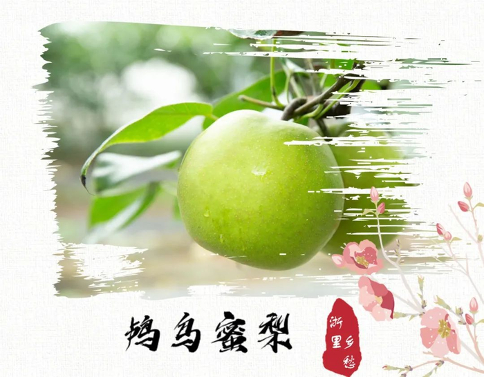鸬鸟蜜梨主产区位于杭州市余杭区鸬鸟镇,地处杭州余杭最西北山区。鸬鸟蜜梨主栽品种有“翠冠”、“翠玉”等。“翠冠”果实近圆形,果皮光滑,果点小,呈黄褐色或绿色,果肉白色,肉质细嫩,汁多甘甜;“翠玉”果实扁圆形、端正,果皮光滑,果点稀、小,底色暗绿,果肉白色,肉质细腻松脆,汁多味甜。