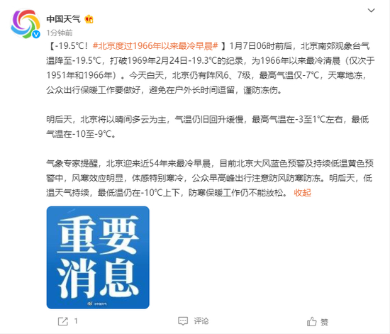 1月7日06时前后,北京南郊观象台气温降至-19.5℃,打破1969年2月24日-19.3℃的纪录,为1966年以来最冷清晨(仅次于1951年和1966年)。今天白天,北京仍有阵风6、7级,最高气温仅-7℃,天寒地冻,公众出行保暖工作要做好,避免在户外长时间逗留,谨防冻伤。