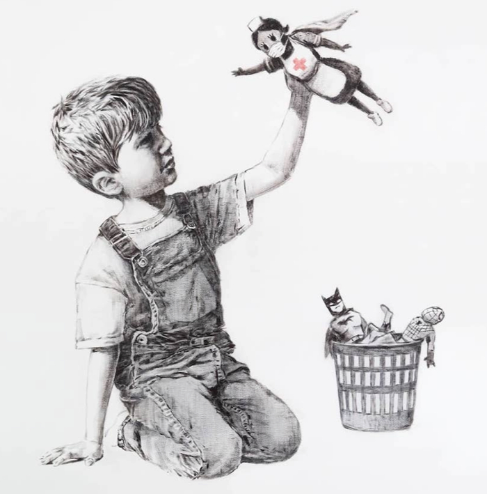 若说班克斯果真不在乎商业运作和现实规则,版权之争似乎很是打脸。或许,从无政府主义的激进涂鸦者到当代艺术界的宠儿,他也逐渐认为法律和商业运作是无法规避的要事。《卫报》称,2020年,班克斯的职业生涯就像过山车,驶过了资本巅峰,也跌入了法律纠纷的谷底。一方面通过难民事件挑战民族国家界限和律法,一方面又为了自己的权益在法律体系中苦苦挣扎。或许只有这种被2020年超现实混乱所激发的强烈矛盾,才能体现这个神秘艺术家的复杂性。但至少,他依然在努力给予一些理想主义的声音,也并不总是吝啬温暖。