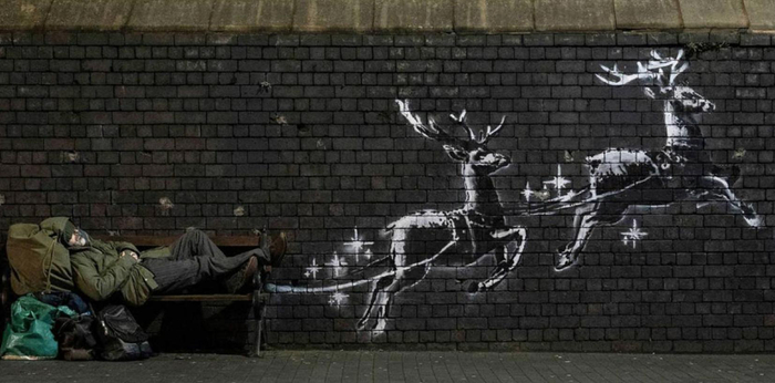 疫情开始后,他在伦敦地铁上留下了警示大家戴口罩的涂鸦,标志性的老鼠仿佛吊在栏杆上喷涂——虽然伦敦政府称该按规则清理的涂鸦还是要清理。他上传了把医护人员当成超人玩具的天真婴孩。2019年圣诞节的涂鸦也许能在各种混乱中体现他的创作原则:在流浪汉落脚的被遗弃的街头沙发旁,他在墙上印上了两只向上飞跃的麋鹿,仿佛在沙发上熟睡的流浪汉就是撑着雪橇的圣诞老人。这里头有辛辣的讽刺,又何尝没有温暖的关怀。