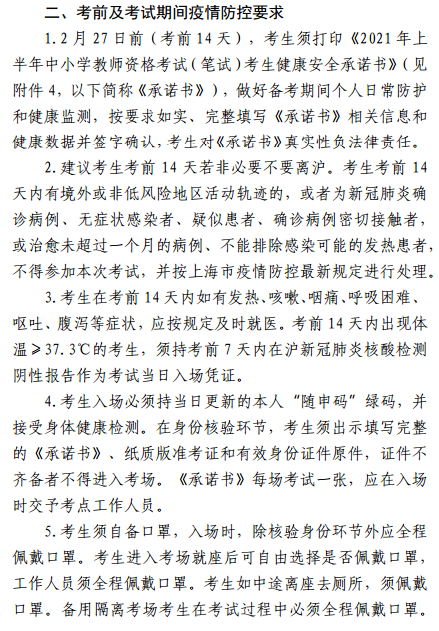 (八)考前防控疫情排查要求。请考生自觉对照《2021年上半年中小学教师资格考试(笔试)上海考区有关疫情防控要求》中的考前防控疫情排查要求进行自我排查,并填写《2021年上半年中小学教师资格考试(笔试)上海考区考生健康安全承诺书》(可点击文末“阅读原文”下载)。不具备考试条件的考生不得参加本次考试。