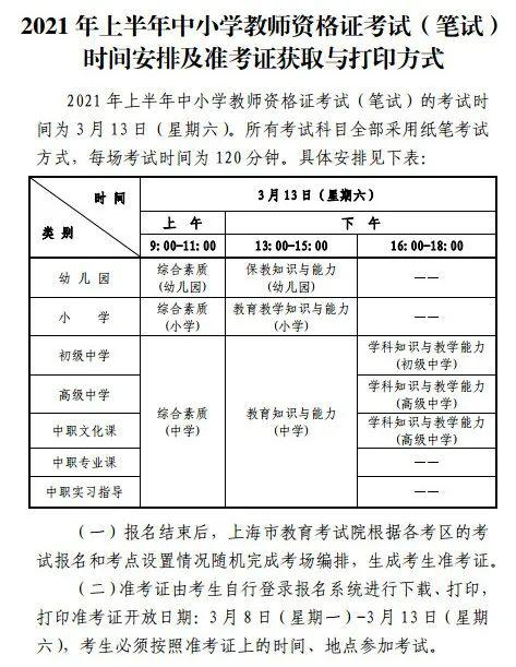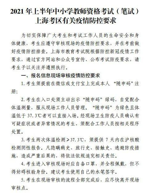 特别提醒:根据本市新冠肺炎疫情最新发展情况,为保障考生健康安全,请考生遵守疫情防控要求,具体要求详见《2021年上半年中小学教师资格考试(笔试)上海考区有关疫情防控要求》。