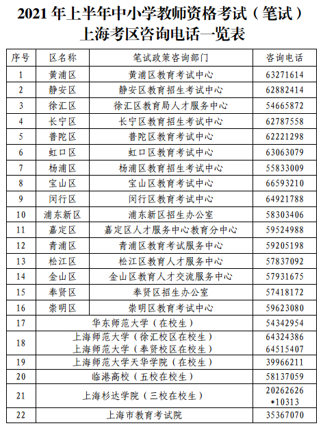 1。考生网上信息输入时间为1月14日(星期四)9:00—1月15日(星期五)24:00。报名政策咨询联系方式见2021年上半年中小学教师资格考试(笔试)上海考区咨询电话一览表: