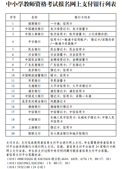 考生在支付过程中有任何问题可联系首信易支付平台客服,支付银行列表详见中小学教师资格考试报名网上支付银行列表。