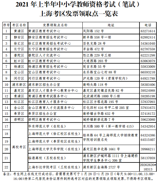 4。考生网上支付成功后,若需要发票可于1月28日(星期四)—1月29日(星期五),每日9:00-11:00,13:00-16:00持第二代居民身份证原件到报名考区领取发票,发票领取点详见2021年上半年中小学教师资格考试(笔试)上海考区发票领取点一览表,不得跨考区领取。