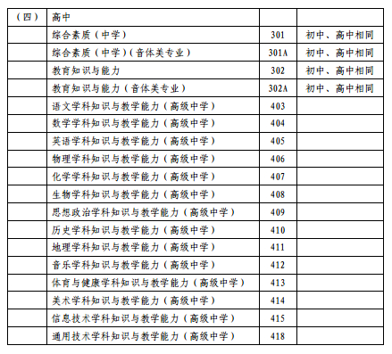 详细考试科目代码见中小学教师资格考试(笔试)科目代码列表: