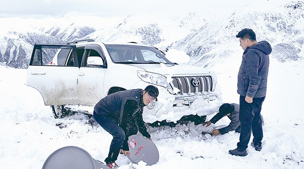 近日,四川省道孚县纪检监察干部到七美乡开展村级换届监督检查时,突遇大雪,车辆被困无法前行,随车人员下车铲雪开路。陈富强 摄