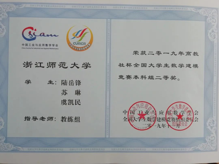 陆岳锋获得“高教社杯”全国大学生数学建模竞赛本科组二等奖