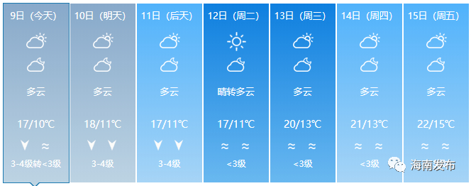 9日白天到11日夜间:本岛文昌、琼海到三亚一带海面,西沙、中沙群岛附近海面,阴天间多云有阵雨,东北风7级,阵风8-9级,9日夜间起减弱到6级,阵风7-8级;北部湾海面,本岛乐东、东方到儋州一带海面,多云,东北风6-7级,阵风8级;本岛临高、澄迈到海口一带海面,阴天间多云有阵雨,东北风6-7级,阵风8级,9日中午起减弱到5-6级,阵风7级;本岛四周沿海各港口所挂强风一号风球不改变;南沙群岛附近海面,阴天有雷阵雨,东北风6级,雷雨时阵风7-8级。