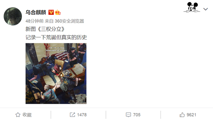 10日,中国漫画家乌合麒麟在微博上贴出描述美国国会骚乱的新作《三权分立》,并写道:“记录一下荒诞但真实的历史。”