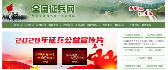 登录“全国征兵网”,进行网上兵役登记应征报名。(全国征兵网:https://www.gfbzb.gov.cn/)