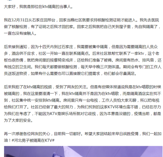 1月10日,抖音平台上有网友发布一则“被隔离到KTV”的视频(经过记者向店主核实隔离场所实际是一家足浴店),引来数十万点赞和数万评论。1月11日下午4时,该网友在社交平台上发声回应,他表示隔离到“KTV”是因为酒店紧张,所以社区将他安排在这,并感谢网友们的关心。