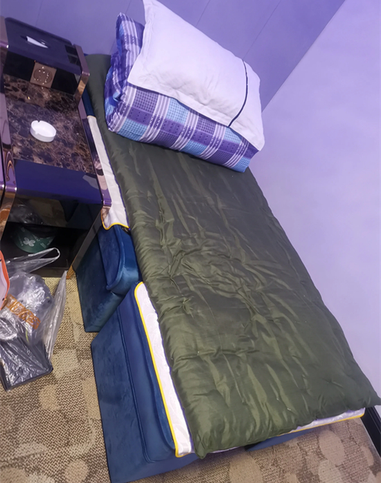 后来接到通知,因为十四天内到过石家庄,我需要被集中隔离,但是因为需要隔离的人员众多,酒店供不应求,社区一开始一直在联系隔离点。后来社区就帮忙联系了一家足浴,这个老板也很热情,就把房间里的按摩椅变成床,还给我们准备了被褥。房间里有热水、排风扇,还有独立的卫生间。我们每天都要做核酸检测,每天早中晚三次测体温。期间会有专门的工作人员送饭送物资,如果有什么需要也可以直接跟它们提需求,他们都会尽量满足。