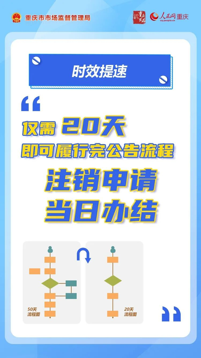相比重庆2017年3月起实施的企业简易注销登记改革,在时限上,《方案》将简易注销公告期从45日压缩到20日,对公告期满无异议的简易注销申请实行“一日办结”。