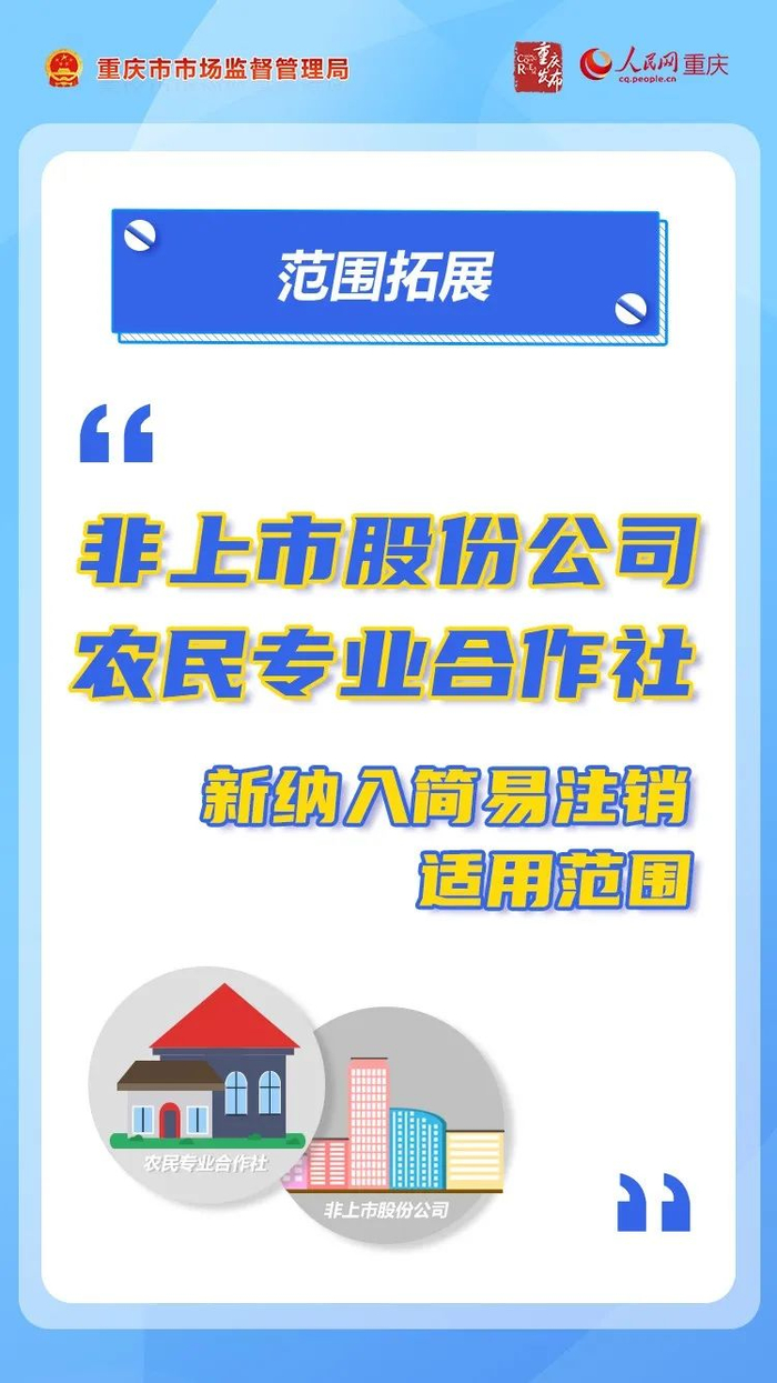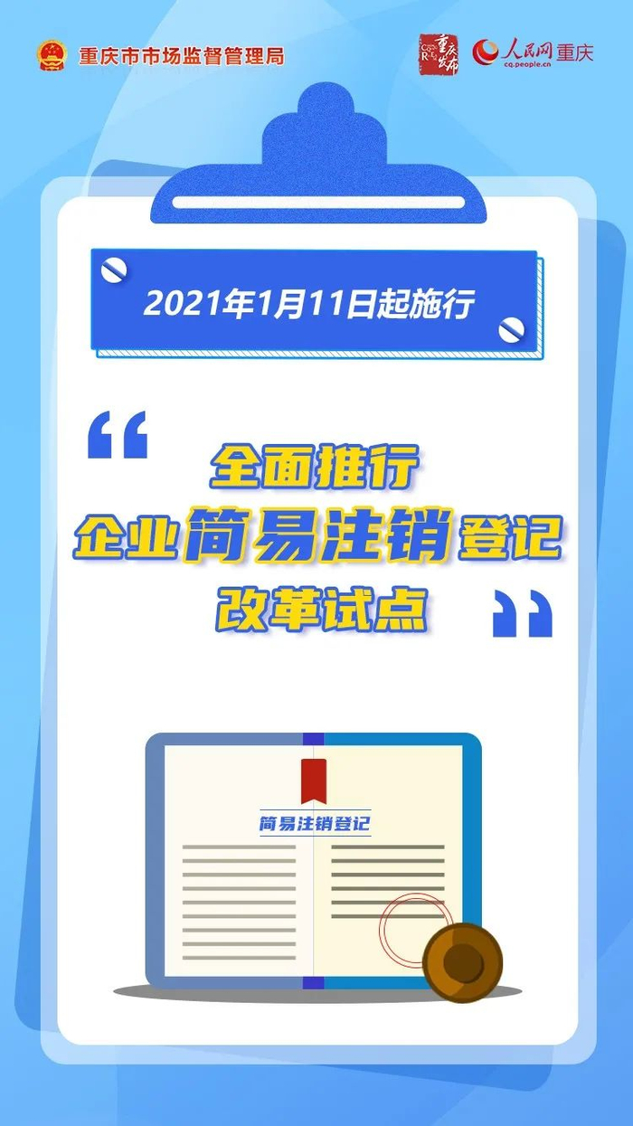 为充分释放改革红利,进一步深化简易注销改革,市市场监管局出台《重庆市市场监督管理局全面推行企业简易注销登记改革试点方案》(以下简称《方案》),并于2021年1月11日起正式施行。