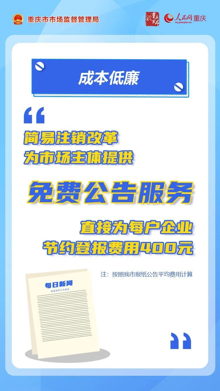 此外,简易注销改革为市场主体提供免费公告服务,按照重庆市报纸公告平均费用计算,直接为每户企业节约登报费用400元。