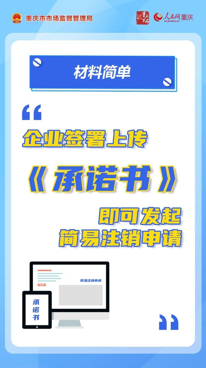 ③减材料,适用简易注销的企业只需提交《企业注销登记申请书》《全体投资人承诺书》和已领取的纸质营业执照正副本,不再提交清算报告、投资人决议、清税证明、清算组备案证明、刊登公告的报纸样张等一系列材料。