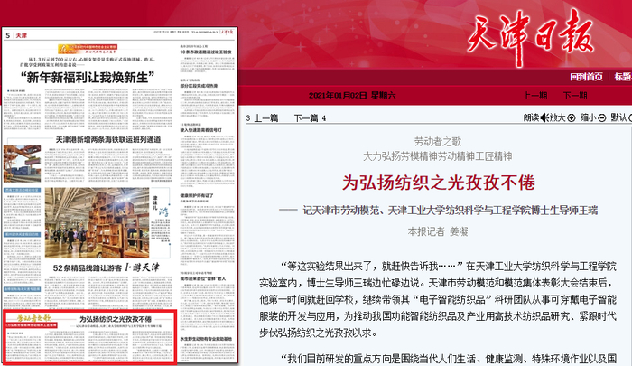 编者按:2021年1月2日,《天津日报》第5版以《劳动者之歌:大力弘扬劳模精神劳动精神工匠精神——为弘扬纺织之光孜孜不倦》为题对我校进行了报道,现将原文转发如下。