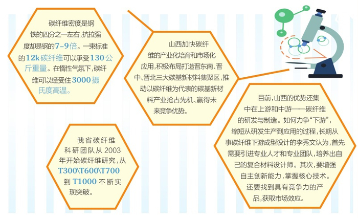 碳纤维研发要从应用端发力来推进技术创新。目前,山西优势还集中在上游和中游——碳纤维的研发与制造。如何力争“下游”,缩短从研发生产到应用的过程,长期从事碳纤维下游成型设计的工程师李秀文认为,这首先需要引进专业人才和专业团队,培养出自己的复合材料设计师。专业人才要具备产品特性分析能力、模具方案结构设计能力、复合材料工艺设计能力及分析和检测方面能力。其次,要增强自主创新能力,掌握核心技术。每个产品的结构特点不同,应用环境也不同,先进经验并不能拿来直接借用。真正要做好碳纤维高端材料的下游应用,还要找到具有竞争力的产品,获取市场效应,才能使碳纤维复合材料的应用得到良性循环发展。