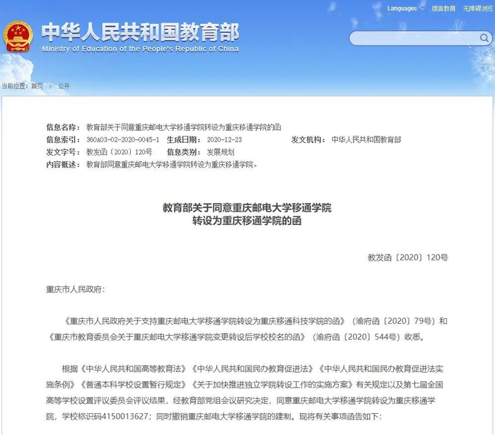 ☞ 重庆邮电大学移通学院转设更名