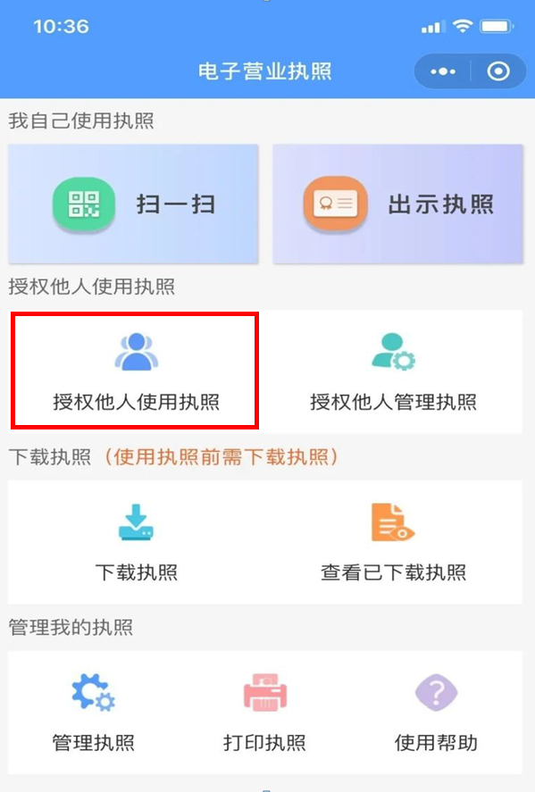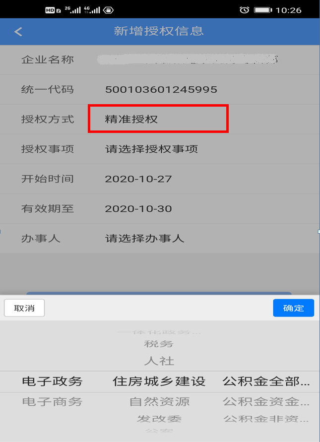 2、企业法定代表人授权。点击“授权他人使用执照”,在“授权方式”栏,点击“精准授权”,选择“电子政务→住房城乡建设→公积金全部业务或者公积金资金业务”,授权本单位住房公积金经办人保管、持有、使用电子营业执照。