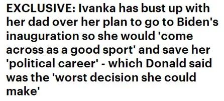 《每日邮报》独家:伊万卡为“给人留下一个有风度的印象”并挽救她的“政治生涯”,就计划参加拜登就职典礼问题而和她父亲闹掰;特朗普说,这是“她所能做的最糟糕的决定”