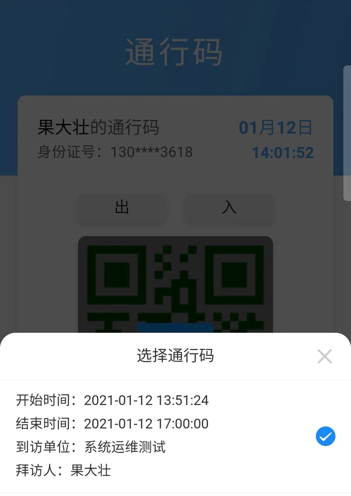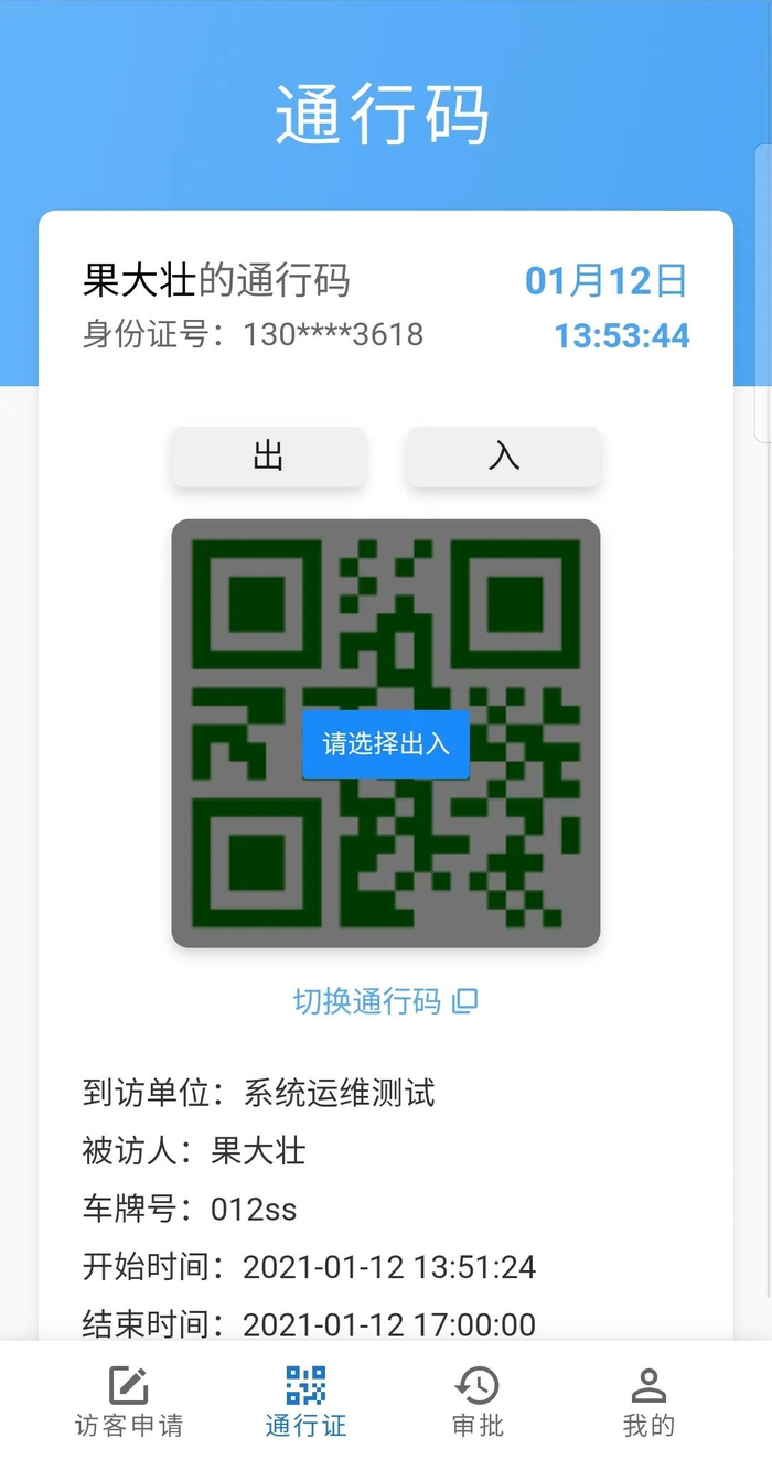 点击底部菜单中的“通行码”按钮,进入通行码页面,进入后显示当前通过申请的通行码中距离当前时间最近的通行码,选择出入按钮后可展示二维码入校,点击切换“通行码”会出现弹框中显示所有通行码列表,可以选择切换当前显示的通行码。