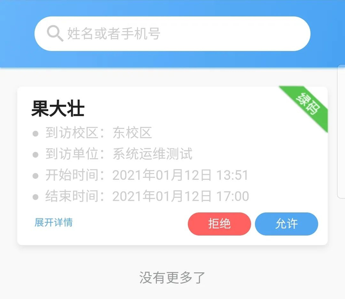 绑定成功后即可进入审批页面(下次进入无需绑定),顶部可以输入姓名或手机号搜索,列表中点击展开详情可以展开显示更多订单信息,点击“拒绝”按钮可以将当前订单拒绝访问,点击“允许”按钮可以将当前订单允许访问,订单卡片右上角显示当前拜访人的健康码状况。