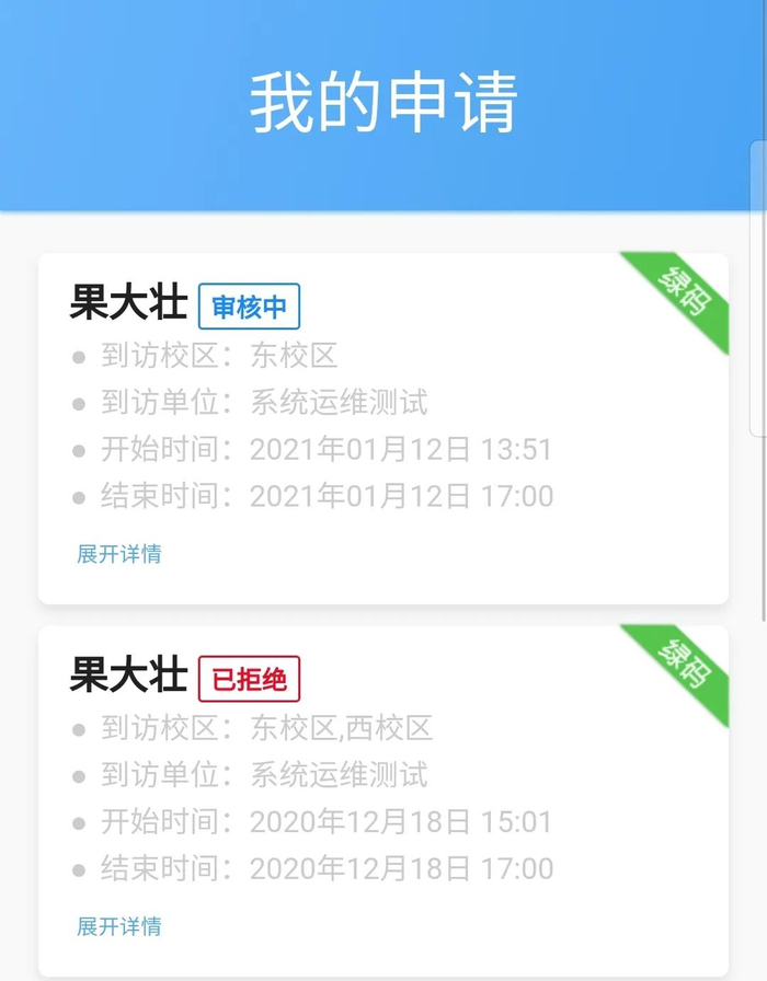 点击“我的申请”进入我的申请列表页面,页面内展示当前登录人所申请的所有访问订单,点击展开详情按钮可查看当前订单更多信息。