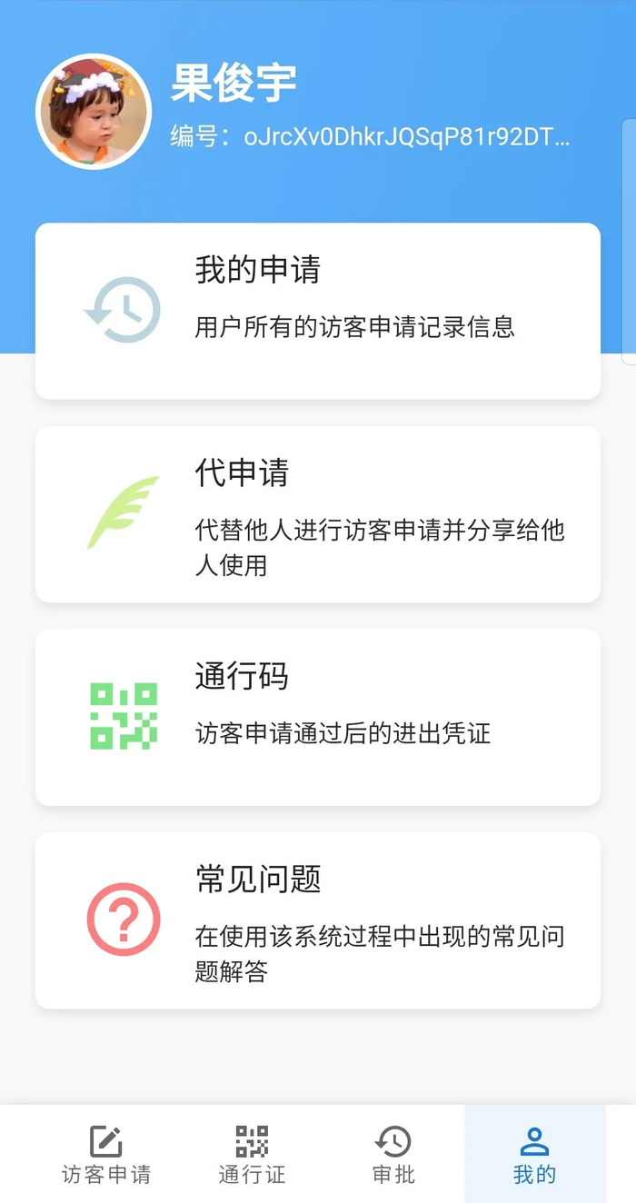 点击底部菜单“审批”按钮,进入审批页面,首次进入需要身份绑定,填写系统管理员白名单账户信息,点击“绑定”按钮即可。系统默认审批人为各单位负责人,如负责人授权他人审批,须出具书面授权书。校外人员进校“谁审批、谁负责”。